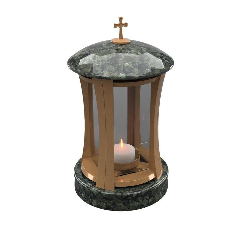 Стильная и надёжная лампада для памятника, выполненная из натурального гранита с декоративной вставкой цвета бронза. Основа и крышка из гранита могут быть изготовлены из камня более чем с 20 различных месторождений — от классического чёрного до эксклюзивных цветных гранитов.
