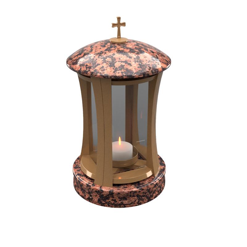 Стильная и надёжная лампада для памятника, выполненная из натурального гранита с декоративной вставкой цвета бронза. Основа и крышка из гранита могут быть изготовлены из камня более чем с 20 различных месторождений — от классического чёрного до эксклюзивных цветных гранитов.