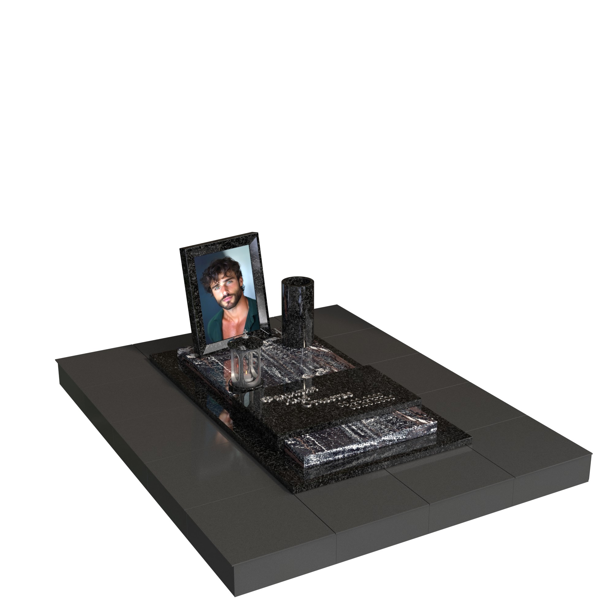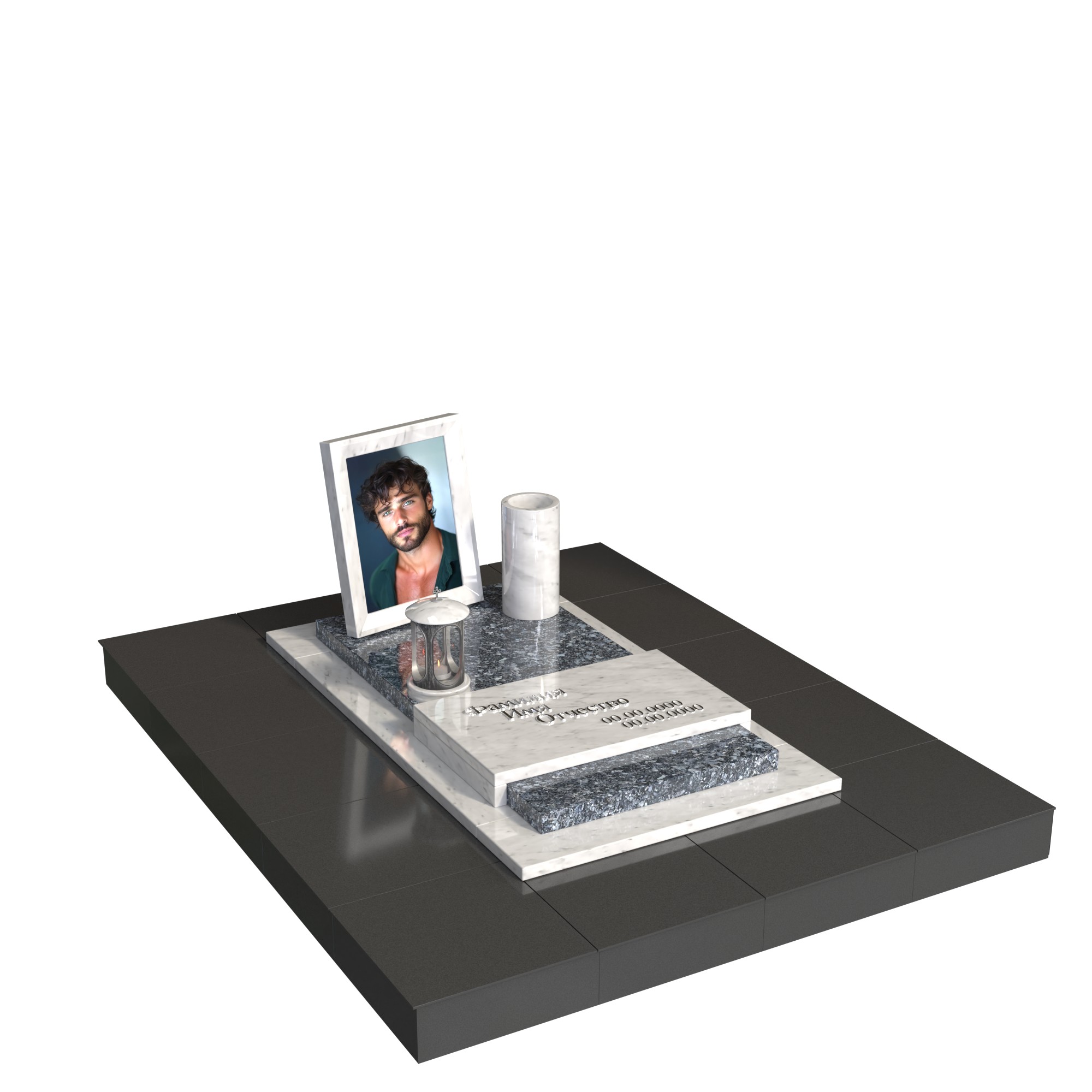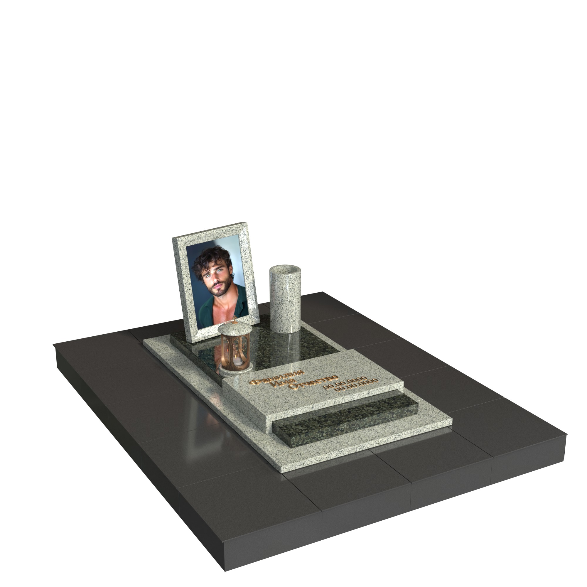 Памятник «Тихий отклик» — компактный горизонтальный мемориал из натурального камня с аккуратной архитектурой и продуманным благоустройством. Наклонная каменная фоторамка делает образ особенно живым, а двухуровневая плита с контрастной вставкой подчёркивает аккуратность и порядок на участке. Композицию дополняют цилиндрическая ваза и лампада, объединённые в едином стиле.