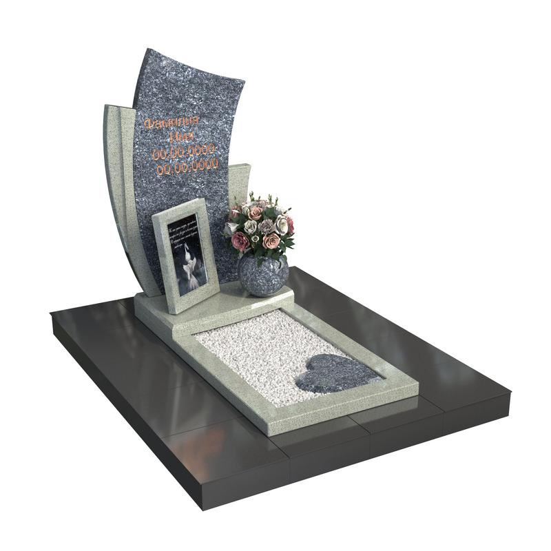 Основная плита выполнена в светло-серых тонах, что придаёт композиции воздушность и визуальную чистоту. Изогнутая форма памятника делает его особенно выразительным и эмоциональным — такой подход всё чаще выбирают при заказе памятников для женщин и мужчин.
