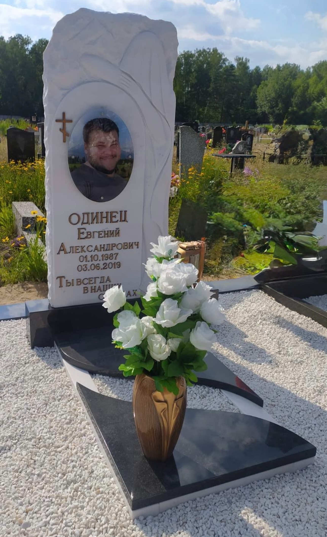 • Материал стелы: Tassos White (Греция) — белый мрамор с лёгкими серыми волнами.