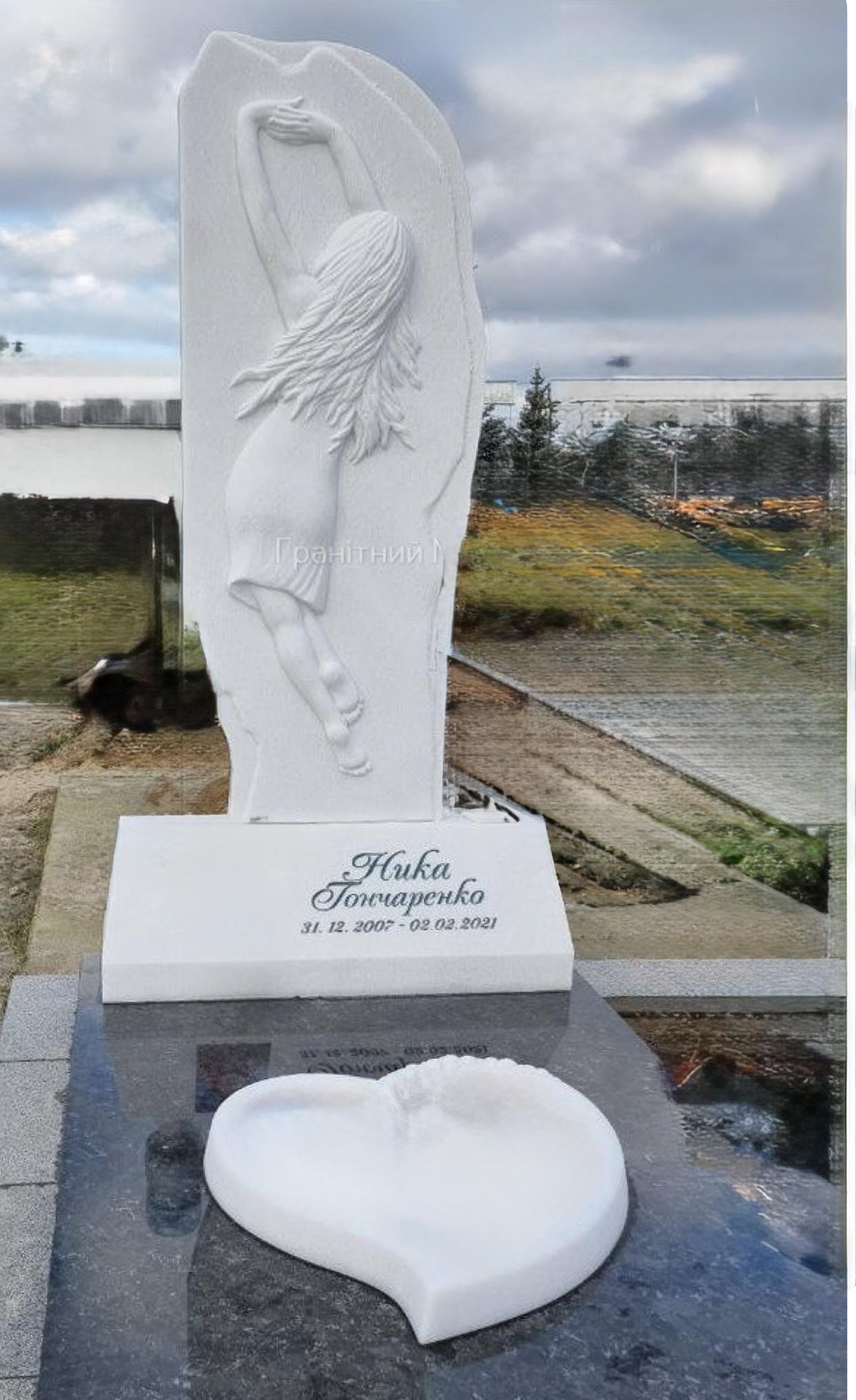 Изящный памятник из натурального мрамора — это воплощение нежности, света и трепетной памяти. Скульптурный барельеф в виде танцующей девушки передаёт ощущение лёгкости и движения, символизируя молодость, свободу и душевную чистоту. Модель дополнена надгробной плитой с сердцевидной чашей, вырезанной из белого мрамора — как символ любви, боли утраты и вечной памяти.
